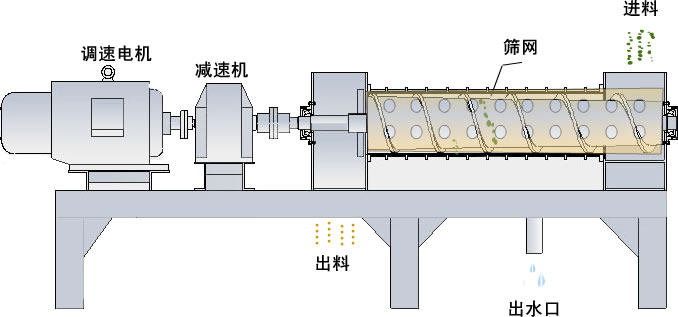 螺旋擠壓脫水機(jī)主要由進(jìn)料箱、軸承座、錐型螺旋、濾水架、濾水籠、機(jī)座、聯(lián)軸器、電機(jī)、減速機(jī)及變速箱等零部件構(gòu)成。其工藝原理如下:需脫水的物料以曲篩 或離心篩預(yù)脫水后,從進(jìn)料口進(jìn)入擠壓機(jī)(對(duì)于含水份小于85%的物料可以直接進(jìn)擠壓機(jī))。物料被錐型螺旋擠壓脫水后,送至出料口,其大部分的水份從篩板濾 出。從而達(dá)到脫水的目的。脫水后的物料可直接進(jìn)干燥機(jī)進(jìn)行干燥。對(duì)于物料品種的不同和產(chǎn)量的變化可通過(guò)調(diào)整擠壓機(jī)轉(zhuǎn)速實(shí)現(xiàn),達(dá)到脫水效果和產(chǎn)量的好搭檔 合。調(diào)速電動(dòng)機(jī)運(yùn)轉(zhuǎn)正常后,物料從進(jìn)料箱均勻加入,進(jìn)機(jī)后的物料在螺旋旋轉(zhuǎn)葉片推動(dòng)下沿軸向前進(jìn),前進(jìn)過(guò)程中物料受變化的螺距和調(diào)節(jié)檔板的作用,形成巨大 的擠壓力,使物料在外力作用下進(jìn)行機(jī)械脫水,水份通過(guò)篩網(wǎng)在出水口處排出,脫水后的物料在出料箱處排出。